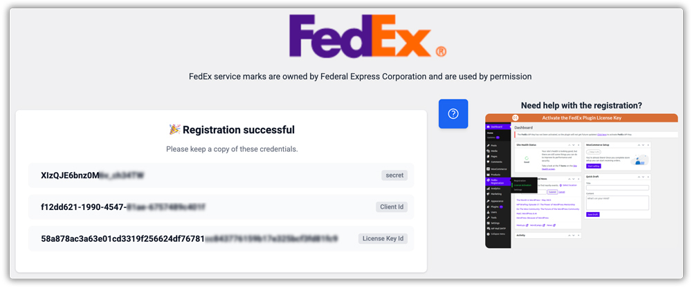After successful verification, your FedEx account will be linked with the plugin. A Registration Successful message will appear with Secret Key, Client ID, and License Key ID.
